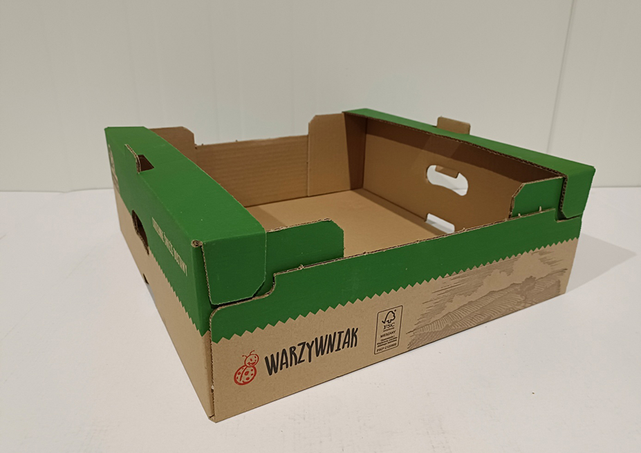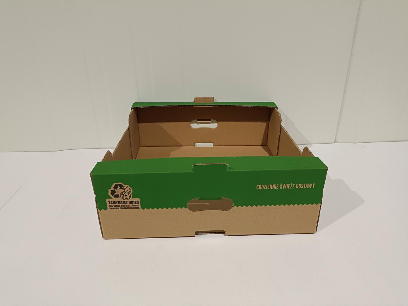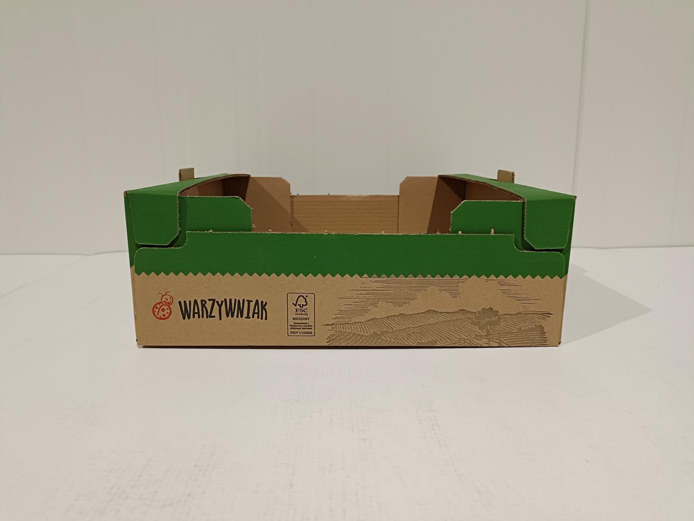 Opakowanie jest biodegradowalne i w pełni nadaje się do recyklingu, co czyni je rozwiązaniem przyjaznym dla środowiska naturalnego. Karton został zaprojektowany tak, aby zapewnić odpowiednią cyrkulację powietrza oraz stabilność podczas transportu i składowania, dzięki czemu idealnie sprawdza się w branży spożywczej, warzywniczej i przetwórczej.
